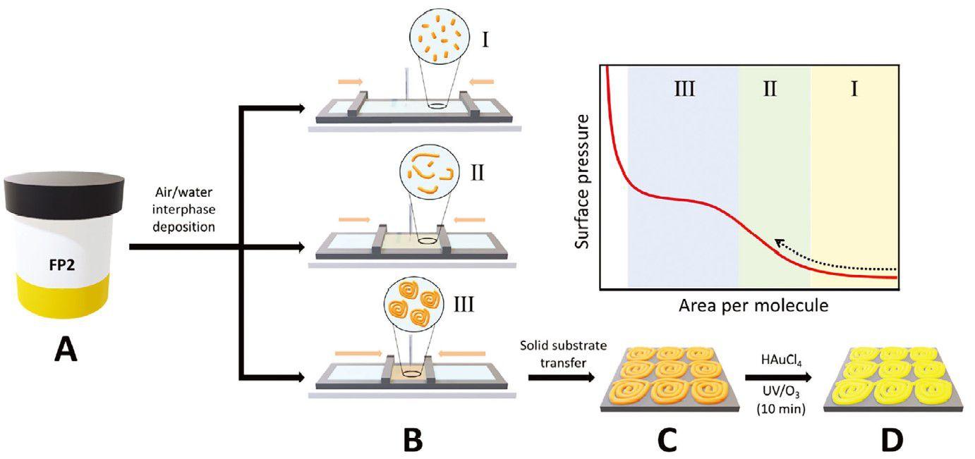 圖1、實驗方法的示意圖總結。A)將肽溶液制備成DMF。B)在空氣-水界面處沉積并使用LB裝置進行壓縮。C)轉移到云母基材上。D)用金屬鹽選擇性浸漬并用UV/O3去除肽。