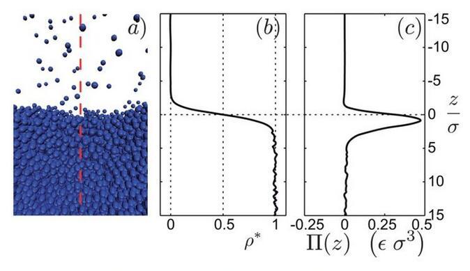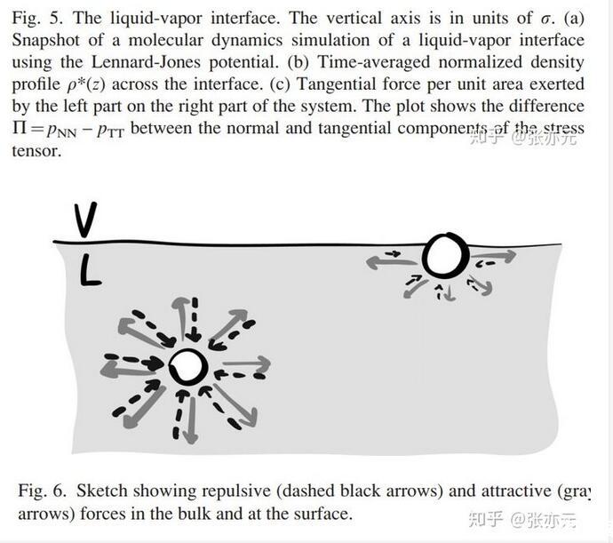 當(dāng)分子間距較小時(shí),斥力為主,分子間距較大時(shí),引力為主。在斥力與引力平衡時(shí),Lennard-Jones勢能最小。現(xiàn)在,我們就可以來詳細(xì)地考慮液-氣界面了。圖5a是通過分子動(dòng)力學(xué)仿真得出的液-氣界面照片,對(duì)應(yīng)的時(shí)間平均密度分布圖是圖5b。從高密度的液體到低密度的氣體發(fā)生在一個(gè)幾個(gè)分子厚度的窄區(qū)域。為了確定毛細(xì)力,我們沿垂直界面方向?qū)⑾到y(tǒng)分為兩個(gè)子系統(tǒng)(圖5a)。考慮左邊子系統(tǒng)對(duì)右邊子系統(tǒng)的單位面積的作用力,即應(yīng)力,在豎直方向上的分布。這個(gè)力有兩個(gè)來源:壓力P和額外壓力Π(圖5c)。圖5c表明有個(gè)力局部存在于界面附近,其實(shí)這個(gè)力就是表面張力,且這個(gè)力范圍和密度突變的范圍很相似。這說明表面張力的確是一個(gè)真實(shí)的力,而不僅僅是表面能的一種純數(shù)學(xué)描述。既然我們發(fā)現(xiàn)在界面附近的確局部存在一個(gè)平行的力,那我們回到問題1,為什么表面張力平行于界面而不是垂直于界面?我們注意到圖1僅僅描繪了分子間引力作用。更全面的圖應(yīng)該如圖6所示,包含了引力與斥力作用。在遠(yuǎn)離界面的液體本體內(nèi),由于液體分子周圍的完全對(duì)稱性,分子的受力完全平衡。但是,靠近界面附近的地方,上下對(duì)稱性被打破。為修復(fù)豎直方向的力平衡,向上的斥力需平衡向下的引力。而在平行于界面的方向,對(duì)稱性仍然存在,平行于界面方向的力平衡仍然存在。這就可以存在一種情況,引力作用的強(qiáng)度與斥力作用的強(qiáng)度不同。實(shí)際上,在界面附近的水平方向上,引力作用比斥力更強(qiáng),這產(chǎn)生了表面張力。