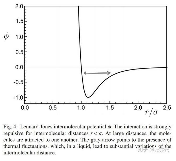 為了從源頭上理解毛細(xì)現(xiàn)象和表面張力,我們首先要考慮的就是液體分子間的作用力。事實(shí)上,一對(duì)液體分子間的作用力要么是引力,要么是斥力,與兩分子間距離相關(guān),一般可用Lennard-Jones勢能表示(圖4)。
