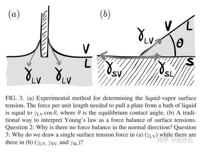測量液-氣表面張力的標(biāo)準(zhǔn)方法是測量將金屬板拉出水面的力,這個(gè)力與表面張力γLV相關(guān)(圖3a)。而對(duì)楊氏方程(圖3b),一般認(rèn)為在接觸線處存在三個(gè)界面張力在固-液界面方向的力平衡γSL+γLVcosθ=γSV。初學(xué)者在此處會(huì)有以下困惑: