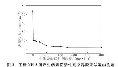 菌株XH-2所產(chǎn)生物表面活性劑具有溫度、pH值和鹽度穩(wěn)定性,其臨界膠束濃度為200 mg·L-1,明顯低于常用的化學(xué)表面活性劑,具有良好的工業(yè)應(yīng)用價值。