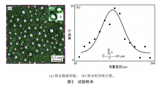 本文以不銹鋼316L(022Cr17Ni12Mo2)球粉為成形原料,顆粒直徑為45~106μm(如圖2所示)【316L不銹鋼的微觀組織:相鄰熔覆道之間的搭接良好。組織主要由胞狀晶和呈外延生長的柱狀晶組成,柱狀晶的取向各不相同。由于熔池邊界處粉末未熔化區域溫度較低,因此一部分晶粒沿著熔池邊界外延生長,同時在SLM過程中,熔池內部經歷快速冷卻,表面張力形成梯度,熔池內部存在“馬戈紊流”,熔池內發生對流,導致熔池內部散熱方向發生改變,因此,造成晶粒顯示出不同的生長方向。胞狀晶呈正六邊形,為柱狀晶的截面,柱狀晶晶粒十分細小,直徑分布在0.4~0.7μm?!浚鶕P者已有的研究結果選擇合適的工藝,詮釋顆粒群的熔合線收縮和再結晶過程。由于試驗粉末顆粒直徑分布廣,為了建立粉末計算模型,用式(1)、(2)計算了顆粒群的當量直徑d和算術平均直徑d。
