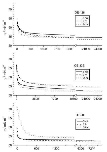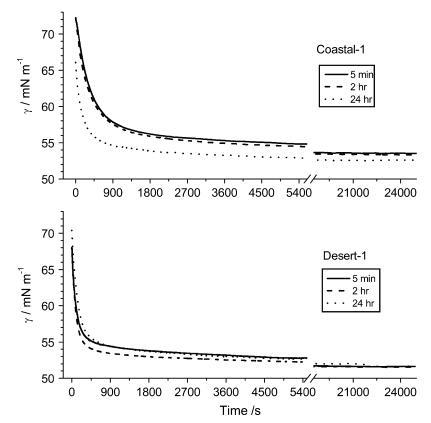 1:1 提取物的動態表面張力測量 表明達到平衡的時間 γLV 從大約 15 分鐘到長達 5 小時不等(圖 1)。 在所有情況下,都有一個相對較快的初始速度 γLV 的變化,這可能是擴散受限的,和 然后是一段長時間的低利率 γLV 的變化。 平衡達到率低的時期被假定為至少兩個過程的結果:(i)不同分子之間的表面競爭 吸附位點; (ii) 表面分子的重排。 時間之間沒有明顯的關系 實現不同的平衡 γLV 和提取時間 土壤(圖 1)。