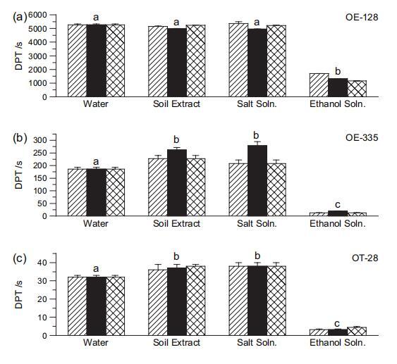 水滴滲透時間 (DPT)、1:1 土壤提取物、鹽 五種測試土壤上的溶液和乙醇溶液顯示在 圖 3. 可以看出 1:1 土壤提取物的 DPT (5 分鐘、2 小時和 24 小時摘錄)等于或大于 比所有土壤的水 DPT。 還看到鹽 溶液(相同的 EC 和相同的單價/二價陽離子比例 土壤提取物,但其 γLV 與水相似)具有 基本上與土壤提取物相同的 DPT。 然而,DPTs 與 γLV 和鹽含量相同的乙醇溶液 土壤提取物顯著低于土壤的 DPT 提取物、鹽溶液和水(圖 3)。