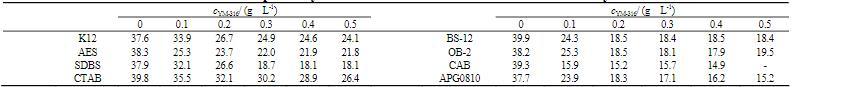 將不同濃度的YM-316分別與質(zhì)量濃度為4.0 g/L的陽離子表面活性劑,如十六烷基三甲基溴化銨(CTAB),陰離子表面活性劑,如十二烷基硫酸鈉(K12)、十二烷基聚氧乙烯醚硫酸鈉(AES)、十二烷基苯磺酸納(SDBS),兩性碳氫表面活性劑,如十二烷基甜菜堿(BS-12)、椰油酰丙基甜菜堿(CAB)、十二烷基氧化胺(OB-2)及非離子APG復配后,測定復配溶液的表面張力,結(jié)果見表1。由表1可見,YM-316與陽離子或陰離子碳氫表面活性劑復配后體系的表面張力降低不明顯,而YM-316與非離子或兩性碳氫表面活性劑復配后體系的表面張力降低顯著,特別是與CAB或APG0810復配后其體系的表面張力可降至14.9 mN/m和15.2 mN/m。