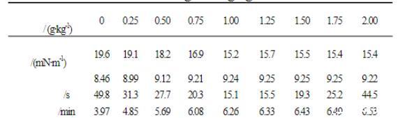 由圖1可知,隨著表面活性劑濃度的逐漸增加,溶液的表面張力顯著降低,當濃度增加到一定值時,表面張力下降到較低值,當濃度繼續(xù)增加時表面張力變化逐漸趨于平緩。YM-316氟碳表面活性劑水溶液的臨界膠束濃度為2.5×10-4mol/L,臨界表面張力為15.3 mN/m。