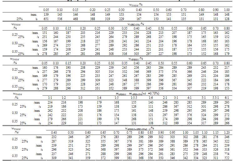 由表3可見,單一的YM-316溶液即可滿鋪在環(huán)己烷表面,表現(xiàn)出較強的鋪展性能。其中,最低鋪展質(zhì)量分數(shù)為0.05%,此時鋪展時間為301.3s。隨著YM-316質(zhì)量分數(shù)不斷增大,鋪展時間不斷減小,當YM-316質(zhì)量分數(shù)達到1.0%時,鋪展時間降低至5.8s。另外,在YM-316分別與APG0810和APEC-10Na的二元復配體系中,當YM-316的質(zhì)量分數(shù)為0.25%、0.30%和0.35%時,在質(zhì)量分數(shù)為0.055%~1.0%的范圍內(nèi),隨著APG0810或APEC-10Na濃度的增加,其體系的鋪展時間逐漸縮短,這種趨勢在低濃度區(qū)域較高濃度區(qū)域要大;而在APG0810或APEC-10Na相同濃度下,隨YM-316質(zhì)量分數(shù)增加其體系的鋪展時間也逐漸縮短。這些均表明YM-316與APG0810或APEC-10Na對環(huán)己烷表面的鋪展作用有良好相互促進效果,YM-316與APG0810和APEC-10Na組成的三元復配體系也是如此,且三元體系的鋪展性能比二元體系更好。氟表面活性劑的成本常常占到水成膜泡沫滅火劑成本的80%,APG0810和APEC-10Na作為一種良好的鋪展助劑,添加到含YM-316的滅火劑中,可在保持溶液原有鋪展性能的情況下,大幅降低YM-316的用量,從而大大降低水成膜泡沫滅火劑的成本。