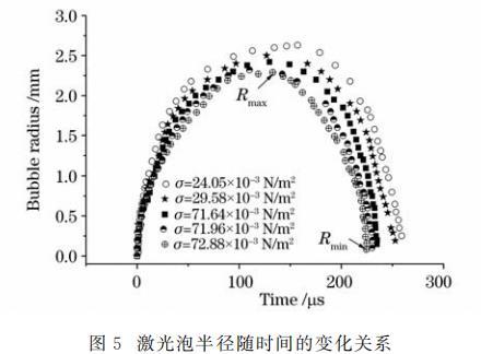 從圖5可以看出,表面張力減緩了空泡的膨脹過(guò)程。在初期,空泡膨脹變緩的現(xiàn)象不甚明顯,愈到后期越明顯。液體張力越大,空泡對(duì)應(yīng)的最大泡半徑越小;表面張力加速了空泡的收縮。表面張力越大,空泡收縮所能達(dá)到的最小泡半徑越小,且表面張力縮短了空泡脈動(dòng)周期。從圖5還可以看出表面張力對(duì)空泡潰滅的影響要強(qiáng)于對(duì)膨脹的影響。此外,激光泡半徑隨表面張力變化與液體的表面張力數(shù)值并不為線性關(guān)系,其關(guān)系有待研究。