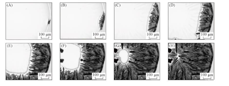 當液滴中NaCl含量較高時,鹽并不是在液滴的邊緣析出,而是在靠近邊緣的位置析出。這可能是液滴蒸發初期毛細補償流與Marangoni對流的競爭使得溶質在近邊緣位置富集所致。此時,液滴邊緣已成為凝膠區(表面張力小),而內部仍為液態區,因而析出的NaCl晶體將在內部液相表面張力的牽引下向內部運動,并逐漸形成更大尺寸的塊狀鹽晶體。說明當NaCl濃度較高時,即使存在PTFE顆粒,仍有部分NaCl會按其自身生長特性形成多面體結構。而液滴邊緣凝膠區枝晶的生長則與圖2相類似,呈現出NaCl與膠體顆粒之間復雜耦合的特點。