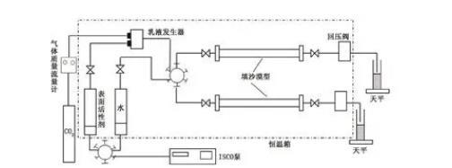 實(shí)驗(yàn)步驟:①利用不同目數(shù)的石英砂填制滲透率約為400×10-3μm2的填砂管模型,初測氣測滲透率,滿足要求后測定水測滲透率,測定滲透率為(350~450)×10-3μm2時(shí)合格,可進(jìn)行下一步實(shí)驗(yàn),稱取巖心管干重M0;②利用真空泵對(duì)填砂管抽真空3 h,飽和水后稱取巖心管濕重M1,則孔隙體積V=(M1-M0)/ρW;③按照?qǐng)D2所示流程圖連接實(shí)驗(yàn)裝置,并依據(jù)實(shí)驗(yàn)方案設(shè)定恒溫箱溫度,恒溫4 h;④依據(jù)實(shí)驗(yàn)方案設(shè)定回壓,水驅(qū)時(shí)速度設(shè)定為1.5 mL/min,CO2乳液驅(qū)時(shí)表面活性劑水溶液及CO2注入速度分別設(shè)定為0.5和1 mL/min,即設(shè)定氣液比為2∶1;⑤實(shí)驗(yàn)過程中記錄注入端壓力變化;⑥并聯(lián)巖心驅(qū)替實(shí)驗(yàn)與單巖心驅(qū)替實(shí)驗(yàn)類似,總流量設(shè)定為5 mL/min。