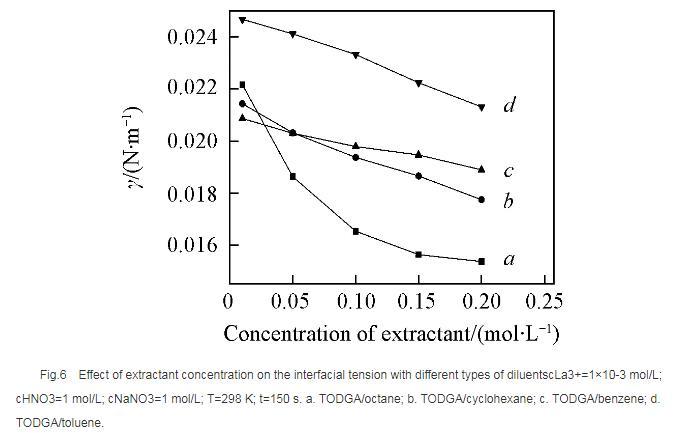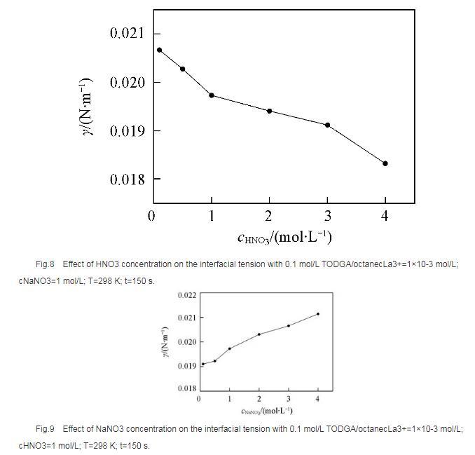 如圖8所示,以正辛烷作為稀釋劑時(shí), TODGA/HNO3萃取La3+的界面張力隨著硝酸濃度的升高逐漸降低。根據(jù)文獻(xiàn)報(bào)道,在硝酸體系中, 3-氧戊二酰胺類萃取劑能夠萃取硝酸,萃取過程中隨著硝酸濃度升高,萃取分配比明顯增大。因此,硝酸濃度較高時(shí)TODGA與硝酸發(fā)生萃取締合作用,使中性萃取劑TODGA質(zhì)子化,其界面活性明顯增強(qiáng),導(dǎo)致界面張力迅速降低,這與圖3結(jié)果一致。
