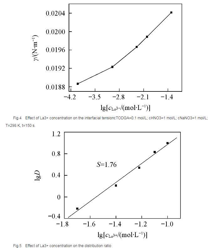 在相同水相條件下,測定了萃取劑濃度對分配比的影響(圖5),根據(jù)斜率法得到萃合物的組成為La(NO3)3·2TODGA.位于界面區(qū)域的萃取劑與金屬離子形成萃合物,界面區(qū)域游離萃取劑分子減少,導(dǎo)致體系的界面張力增大。