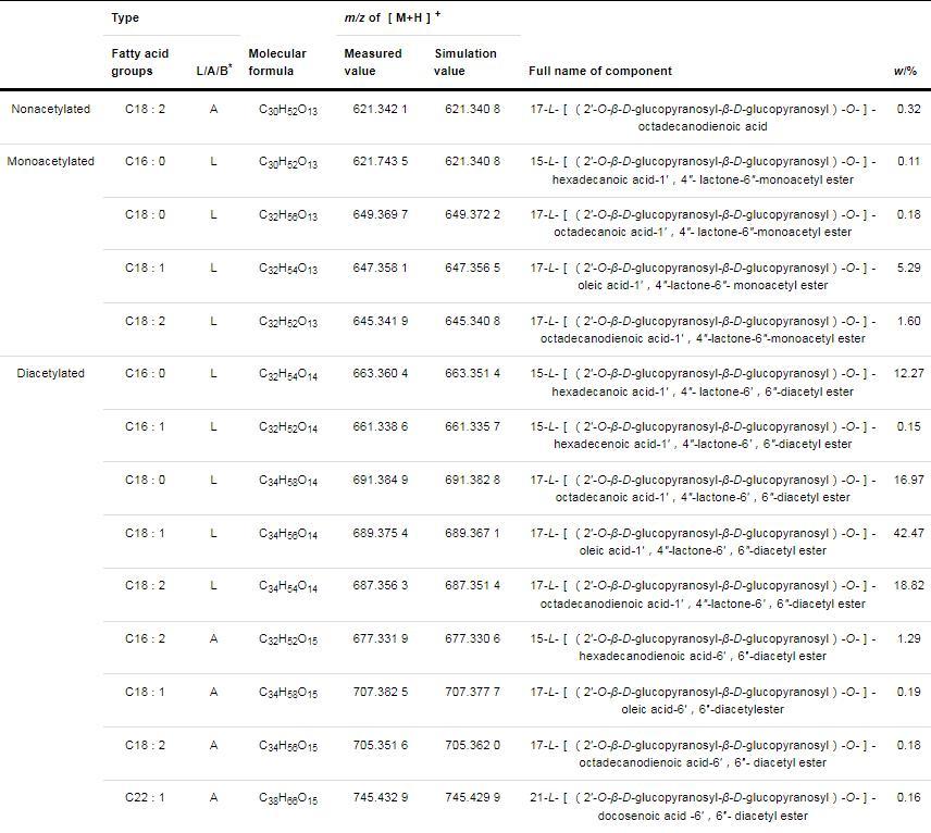表1、表2和圖3分別顯示了乙酰化SLs和去乙?;疭Ls的同系物組分及3種有代表性的同系物結(jié)構(gòu)圖,從表中可以看出,乙?;疭Ls的親水基主要為雙乙酰化的槐糖,雙乙?;M分高達(dá)92.50%;疏水基以十八碳的疏水基為主,其中十八烯酸疏水基質(zhì)量分?jǐn)?shù)為47.95%;內(nèi)酯類型的SLs質(zhì)量分?jǐn)?shù)為97.86%。去乙酰化SLs同系物中的疏水基中十八烯酸質(zhì)量分?jǐn)?shù)最高,達(dá)到27.87%,親水基主要為去乙?;幕碧?,質(zhì)量分?jǐn)?shù)為90.56%,即使發(fā)酵菌株被敲除了乙酰化關(guān)鍵基因,該產(chǎn)物中仍然有9.44%的單乙?;碧侵?,可能胞內(nèi)存在其他低效率的乙?;緩剑唧w原因有待進(jìn)一步研究。去乙?;疭Ls同系物中含有內(nèi)酯型、酸型和bola型SLs,質(zhì)量分?jǐn)?shù)分別為26.99%、49.98%和23.03%;而乙酰化SLs同系物中以內(nèi)酯型為主,質(zhì)量分?jǐn)?shù)達(dá)到97.86%,酸型同系物質(zhì)量分?jǐn)?shù)為2.14%,未發(fā)現(xiàn)bola型SLs。這是由于乙酰化SLs菌株和去乙?;疭Ls菌株對底物的代謝途徑和效率不同。乙酰轉(zhuǎn)移酶基因AT的敲除使大部分SLs分子不再發(fā)生乙酰化。在去乙?;疭Ls產(chǎn)品中bola型SLs分子質(zhì)量分?jǐn)?shù)高達(dá)23.03%,與Saerens等的研究結(jié)果一致。