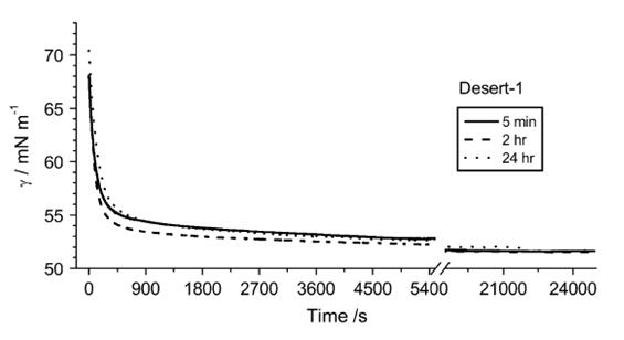應用EZ-PIplus表面張力儀">表面張力儀測試不同時間浸潤土壤后得到的土壤浸潤液的動態(tài)表面張力。