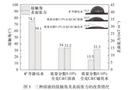 質量分數0.10%塵克C&C溶液的表面張力為33.2 mN/m.相較于礦井靜壓水,其表面張力減小了43.82%.質量分數0.10%塵克C&C磁化水的表面張力為31.3 mN/m.相較于礦井靜壓水,其接觸角減小了47.04%.由此可以看出,塵克C&C試劑和磁化相結合可更好地降低溶液的氣~液界面張力,使得溶液與低水分無煙煤顆粒接觸時,更容易排出固~氣~液三相界面的氣體,以減弱其濕潤阻力。