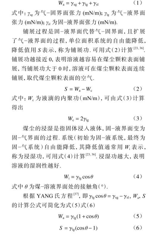 煤塵的沾濕是指液體與煤體從不接觸到接觸,變液~氣界面和固~氣界面為固~液界面的過程。這個過程使得系統(初始為固~氣系統、液~氣系統,最終為固~液系統)的表面自由能降低,其降低值通常用Wa來表示,稱為粘附功,可用式(1)計算。粘附功越大,表明溶液濕潤性越好。
