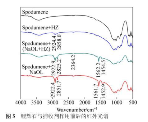 鋰輝石與不同藥劑作用前后的紅外光譜如圖5所示,鋰輝石與NaOL作用后在2922.4和2851.7 cm?1波長(zhǎng)處都有峰存在,在此波長(zhǎng)范圍內(nèi)為甲基(—CH3)、亞甲基(—CH2—)的伸縮振動(dòng)共振峰,表明NaOL在鋰輝石表面有吸附作用。在1561.7和1452.9 cm?1波長(zhǎng)處有新峰產(chǎn)生,其中1452.9 cm?1波長(zhǎng)處為亞甲基(—CH2—)的變形振動(dòng)共振峰,1561.7 cm?1處為油酸鋁的吸收峰,表明NaOL在鋰輝石表面生成了新的物質(zhì),新峰產(chǎn)生表明這種吸附作用是化學(xué)吸附。鋰輝石與HZ作用后在2924.4和2858.0 cm?1波長(zhǎng)處都有峰存在,在此波長(zhǎng)范圍內(nèi)為甲基(—CH3)、亞甲基(—CH2—)伸縮振動(dòng)共振峰,表明HZ在鋰輝石表面有吸附作用。而鋰輝石與HZ藥劑作用后,光譜圖譜中沒有新峰產(chǎn)生,表明這種吸附不是化學(xué)吸附,HZ是一種非離子型捕收劑,它在鋰輝石表面的吸附不是靜電吸附,結(jié)合Zeta電位結(jié)果分析推測(cè)這種吸附可能是氫鍵作用。鋰輝石與(NaOL):(HZ)=5:1組合捕收劑作用有新的峰產(chǎn)生,但仍是和鋰輝石與NaOL作用后的吸收峰類似,表明捕收劑經(jīng)過組合后,HZ并沒有和NaOL生成新的物質(zhì)從而改變吸收峰的位置。
