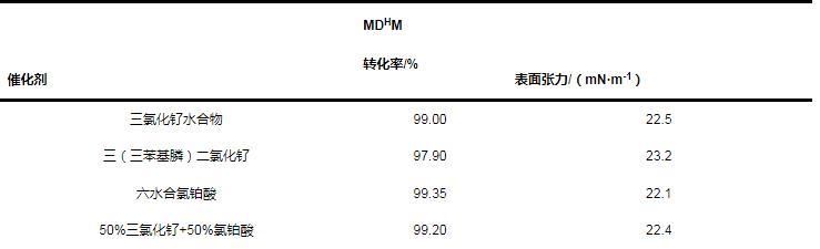 分別以三氯化釕、三(三苯基膦)二氯化釕、六水合氯鉑酸和50%三氯化釕+50%氯鉑酸為催化劑,在以下條件下合成BEOTSS:催化劑用量30 mg/kg(以Ru或Pt質(zhì)量計),n(BEO)∶n(MDHM)=1.05∶1,反應(yīng)時間6.0 h,反應(yīng)溫度100℃。測定MDHM轉(zhuǎn)化率以及0.1%BEOTSS水溶液的表面張力,結(jié)果如表1所示??梢钥闯觯@幾種催化劑的效果均較好,MDHM轉(zhuǎn)化率在97%以上,表面張力低于24 mN/m。其中,三氯化釕的催化效果與傳統(tǒng)的氯鉑酸相差不大,只是所得產(chǎn)物為黃色液體,比氯鉑酸的產(chǎn)物顏色深。考慮到三氯化釕價格比氯鉑酸便宜很多,因此采用三氯化釕作為催化劑具有很好的成本優(yōu)勢。
