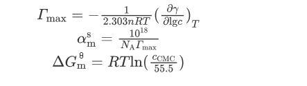 將BEOTSS配制成不同濃度的水溶液,測定其平衡表面張力,繪制表面張力γ與濃度對數(shù)lgc的關(guān)系曲線。當(dāng)γ-lgc曲線出現(xiàn)轉(zhuǎn)折時,轉(zhuǎn)折點對應(yīng)的濃度即為臨界膠束濃度(CMC),對應(yīng)的表面張力為γCMC。飽和吸附量(Γmax)、界面上每個表面活性劑分子所占的最小面積()以及膠束化標(biāo)準(zhǔn)自由能(Δ)由以下公式[1,21]得到。