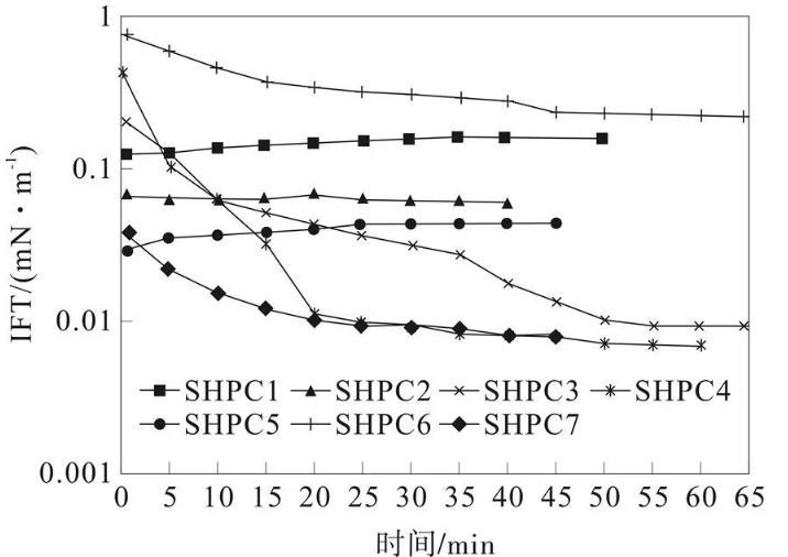 將SHPC1~7活性體系溶液配制為濃度大小為0.25%的溶液,密閉24 h,然后利用Texas-500C界面張力儀對(duì)界面張力進(jìn)行動(dòng)態(tài)測(cè)定,從而得到圖2所示的結(jié)果。