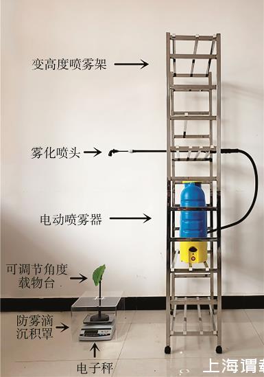 流失點和最大穩定持留量的測定裝置見圖2。將噴霧器固定在可變高度噴霧架上,噴頭與地面垂直,分別設置噴嘴下沿與葉片中心垂直距離50、100、150和200 cm 4種噴霧距離,噴霧器中裝入水,進行噴霧時關閉靜電功能。測定裝置由載物臺、電子秤和防霧滴沉積罩3部分組成。其中載物臺可進行90°以內的傾斜角度調整;電子秤精度為0.01 g(YH-50002型,東陽市英衡智能設備有限公司);防護罩為透明的亞克力材料制成,防止霧滴沉積到電子秤上。