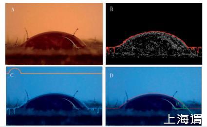 A.顯微鏡拍攝的葉面測試液滴B.用Canny算法進行邊緣檢測(紅色線為提取的輪廓曲線)C.輪廓擬合(黃色線為去除干擾后的輪廓曲線)D.確定并測定接觸角(紅色線為優化后的輪廓曲線,右側兩條綠色線的夾角即為接觸角θ)。放大倍數為1 000倍