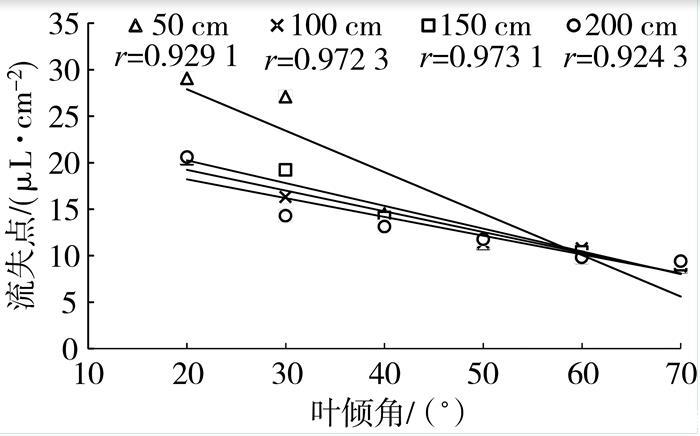 流失點(diǎn)是農(nóng)藥噴施量的關(guān)鍵決定參數(shù),當(dāng)農(nóng)藥噴施量超過流失點(diǎn),會減少藥液在葉片表面的持留量,降低藥效且造成農(nóng)藥的浪費(fèi)。圖4表明,流失點(diǎn)與葉傾角呈顯著負(fù)相關(guān),且隨著噴霧距離增加,斜率降低,說明葉傾角和噴霧距離對流失點(diǎn)均有顯著影響。