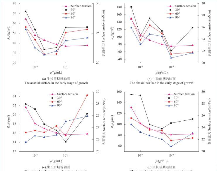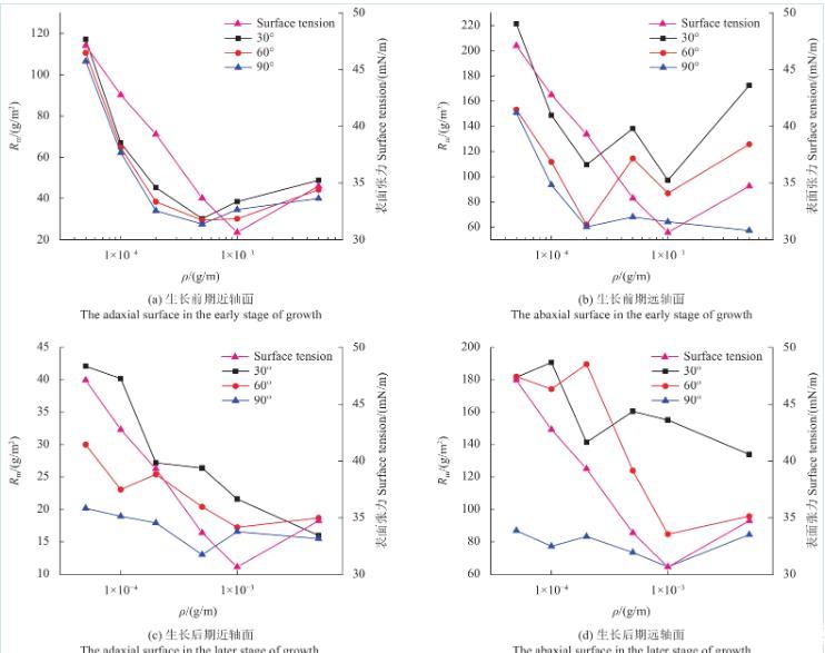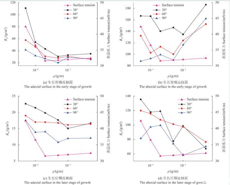 圖6為不同濃度SilwetL-77溶液在蘋(píng)果葉片近、遠(yuǎn)軸面的Rm變化規(guī)律。由圖可知,當(dāng)溶液質(zhì)量濃度低于cmc時(shí),蘋(píng)果葉片生長(zhǎng)前、后期遠(yuǎn)軸面的Rm值和表面張力均隨溶液質(zhì)量濃度的降低而減小。此外,蘋(píng)果葉片生長(zhǎng)后期近軸面只有在30°傾角時(shí)的Rm值與表面張力隨溶液質(zhì)量濃度的提高而減小,60°傾角和90°傾角時(shí)Rm值隨溶液濃度變化不大。蘋(píng)果葉片生長(zhǎng)后期遠(yuǎn)軸面Rm值和表面張力隨溶液濃度的變化與生長(zhǎng)前期基本一致。