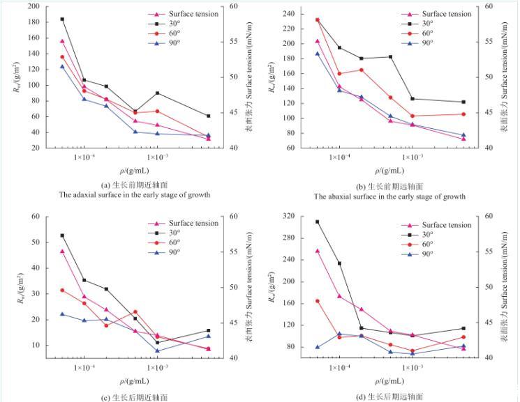 圖5為不同質(zhì)量濃度Triton X-100溶液在蘋(píng)果葉片近、遠(yuǎn)軸面的Rm變化規(guī)律。從中可以看出,不同傾角下蘋(píng)果葉片生長(zhǎng)前期近、遠(yuǎn)軸面的Rm值和表面張力均隨溶液質(zhì)量濃度的升高而不斷減小,當(dāng)Triton X-100溶液質(zhì)量濃度達(dá)到cmc時(shí),近軸面Rm值與表面張力的變化趨于平緩,而遠(yuǎn)軸面的Rm值則出現(xiàn)大幅波動(dòng)。其原因可能與Triton X-100表面活性效率高(cmc=1.32×10?4 g/mL)有關(guān),同時(shí)溶液色散分量占比會(huì)隨溶液質(zhì)量濃度的升高而提高,而對(duì)蘋(píng)果葉片遠(yuǎn)軸面表面自由能起主導(dǎo)作用的也是色散分量,以上多重因素導(dǎo)致遠(yuǎn)軸面的Rm值產(chǎn)生波動(dòng)。蘋(píng)果葉片生長(zhǎng)后期Rm與表面張力隨溶液質(zhì)量濃度的變化與生長(zhǎng)前期相似。