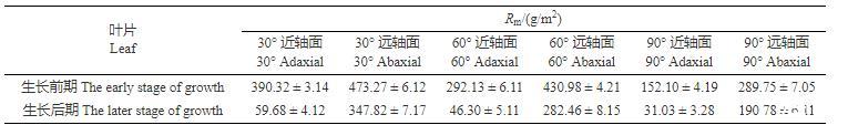 以上結(jié)果表明,蘋(píng)果葉片生長(zhǎng)前期近軸面的Rm值高于生長(zhǎng)后期,且在同一生長(zhǎng)期,蘋(píng)果葉片遠(yuǎn)軸面的Rm值遠(yuǎn)高于近軸面。此外,蘋(píng)果葉片的Rm值隨葉傾角的增大而減小。