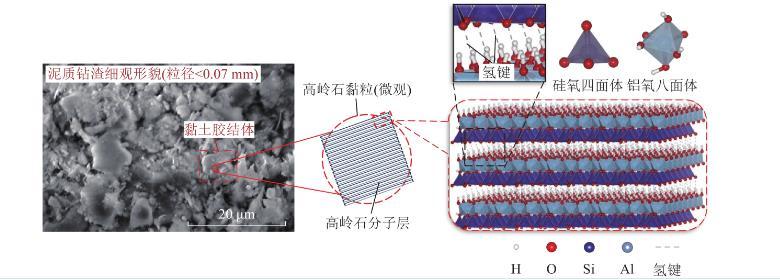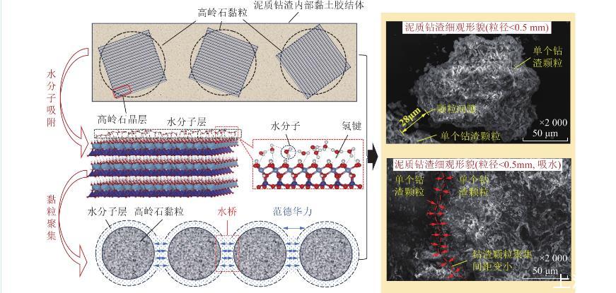 圖2中,在微觀尺度層面,由于高嶺石形成過程中發(fā)生同晶置換,使晶層表面帶永久負(fù)電荷。當(dāng)高嶺石黏粒遇水時,水分子的偶極性使氫原子易與高嶺石晶層表面電負(fù)性較強的氧原子結(jié)合形成氫鍵,同時,吸附在晶層表面的水分子之間也會通過氫鍵連接,該過程即為水分子的吸附過程。當(dāng)?shù)?層水分子被高嶺石黏粒吸附后,其外側(cè)氧原子呈負(fù)電性,繼續(xù)與第2層水分子的氫原子以氫鍵形式結(jié)合,最終形成多層水分子“水膜”。高嶺石黏粒不斷吸水?dāng)U層,使鉆渣顆粒體積不斷膨脹,同時伴隨鉆渣內(nèi)部非泥質(zhì)礦物的溶解,高嶺石黏粒間距變小,并通過外側(cè)“水膜”相互吸附,構(gòu)成“水橋”,使得多個高嶺石黏粒能夠在遇水后聚集,形成更大的團(tuán)聚體。
