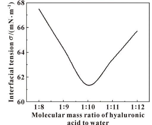 分子動力學中認為界面張力與不同方向上的壓力張量有關,仿生黏液透明質酸體系-水的界面張力通過KIRKWOOD和BUFF提出的力學定義來進行計算。通過對5個不同質量比的體系在平衡后200 ps的數據進行統計,得到了一個仿生黏液和水界面的界面張力平均結果,如圖1所示。可見在研究的質量比范圍內,透明質酸仿生黏液與水的界面張力始終保持在(60.00±10)mN/m左右,其中透明質酸和水分子的質量比接近1∶10時,界面張力最小(為61.33 mN/m)。仿生黏液和水界面的界面張力越小,體系中仿生黏液和水界面的自由能就越低,界面就較穩定。因此,可以認為在研究的質量比范圍內,質量比1∶10時,模擬黏液-水的界面穩定性最優。這同時也證明,通過分子動力學模擬的方法可以初步預測仿生黏液在水體中的穩定性。