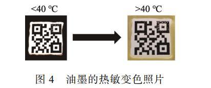 進(jìn)一步探索通用油墨功能化的可能性。在通用油墨的配方中引入熱敏黑材料,以檢驗(yàn)其熱變色防偽性能。如圖4所示,二維碼的黑色邊框采用熱敏黑復(fù)合通用油墨。當(dāng)溫度>40℃時,中間的普通商用油墨顏色保持不變,而熱敏黑復(fù)合通用油墨邊框則逐漸變?yōu)榈S色。