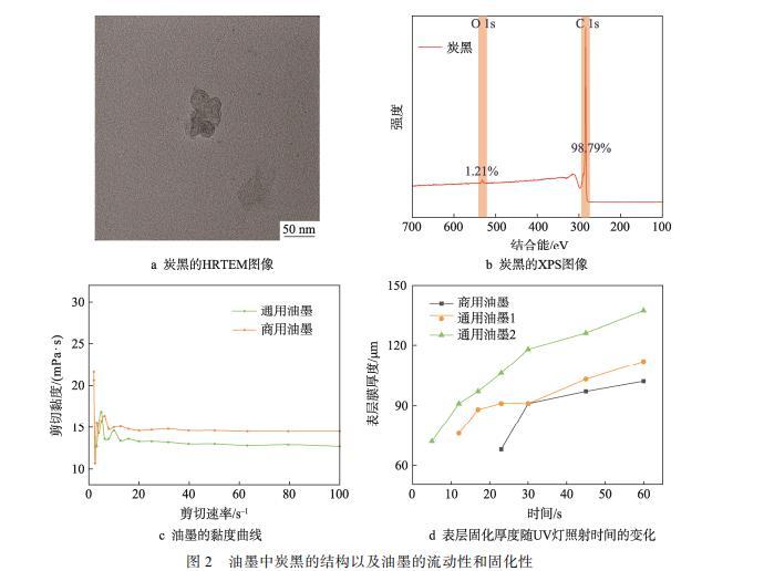 在制備油墨時,需關(guān)注黏度、分散穩(wěn)定性和固化速度,確保噴碼順利。炭黑是關(guān)鍵組分,為避免炭黑團(tuán)聚導(dǎo)致穩(wěn)定性下降和打印堵塞,選擇粒徑適中的炭黑。粒徑過小易團(tuán)聚,過大可能堵塞,所選炭黑粒徑在50 nm左右,HRTEM圖像如圖2a所示。對所選炭黑進(jìn)行XPS分析,發(fā)現(xiàn)其氧含量高達(dá)1.2%,如圖2b所示。這一特性有望改善炭黑與油墨中極性液體的相互作用,從而進(jìn)一步提升油墨的穩(wěn)定性。炭黑的良好分散性不僅有助于提高油墨的穩(wěn)定性,還有助于降低油墨的黏度。如圖2c所示,通用油墨的黏度降至13.0 mPa·s,相比商用油墨的15.5 mPa·s下降約17%,黏度的降低更有利于噴墨打印的流暢進(jìn)行。