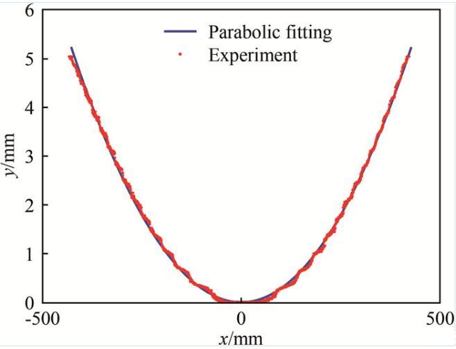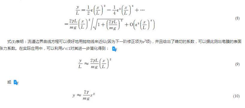 Sane等推導(dǎo)了表面張力系數(shù)與尼龍繩曲線方程的關(guān)系,但并未獲得曲線方程的精確解,而是采用高階多項(xiàng)式對(duì)實(shí)測(cè)曲線進(jìn)行擬合,發(fā)現(xiàn)選取二階多項(xiàng)式可以得到較好的結(jié)果,從而也獲得了式(10),并通過擬合系數(shù)得到了表面張力系數(shù)。本文的嚴(yán)格推導(dǎo)說明:流道邊界曲線是拋物線加上高兩階小量的修正。圖(2)也證明了這一推導(dǎo)結(jié)論的正確性。