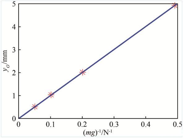 圖3給出了在同一皂液流量Q=35 mL/min下測(cè)得的流道中點(diǎn)O的位移隨砝碼質(zhì)量的變化以及根據(jù)式(11)擬合的直線。所有數(shù)據(jù)點(diǎn)都很好地落在過原點(diǎn)的擬合直線上,進(jìn)一步驗(yàn)證了本文推導(dǎo)的正確性。根據(jù)直線斜率測(cè)得的表面張力系數(shù)γ=27.1 mN/m,與前述拋物線擬合法得到的結(jié)果相近。