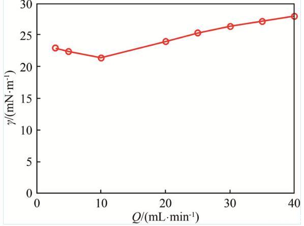 利用這一方法,還測(cè)量了表面張力系數(shù)隨皂液流量的變化關(guān)系,如圖4所示。圖中曲線并非如部分文獻(xiàn)報(bào)道的“表面張力系數(shù)隨皂液流量增加而單調(diào)下降”,這可能是由于表面張力系數(shù)隨皂膜厚度變化而有所變化、且實(shí)驗(yàn)中皂膜厚度并非均勻分布導(dǎo)致的。