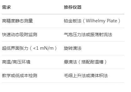 樣品性質:高粘度液體適合懸滴法或旋轉滴法,易揮發(fā)液體需密閉測量(如氣泡壓力法)。
