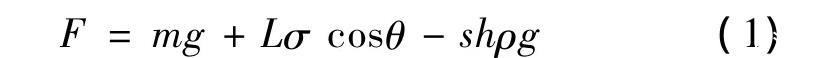 式中:F為平衡力,N;m為感測白金板的重量,kg;s為感測白金板橫截面面積,m2;h為浸入待測溶液的深度,m;L為感測白金板周長,m;σ為待測溶液的表面張力,mN/m;g為重力加速度,N/kg;θ為待測溶液和白金板的接觸角,°;ρ為待測溶液的密度,kg/m3。