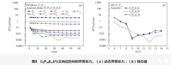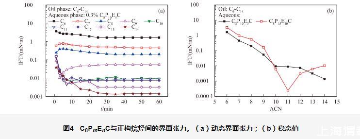 圖5 C8PmEnS與正構烷烴間的界面張力。(a)動態界面張力;(b)穩態值
