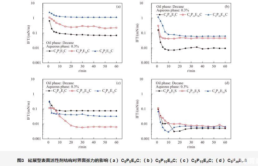 表面活性劑分子結構是決定降低界面張力能力的關鍵因素。圖3為分子結構對延展型表面活性劑與正癸烷間動態界面張力的影響趨勢。在此,主要考察了PO數目、EO數目和陰離子頭基類型這3種結構要素的影響。