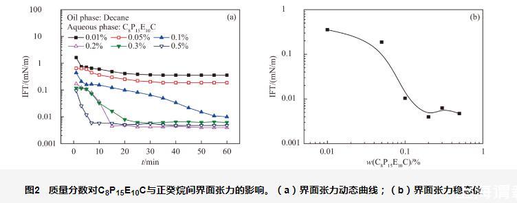 圖2質量分數對C8P15E10C與正癸烷間界面張力的影響。(a)界面張力動態曲線;(b)界面張力穩態值