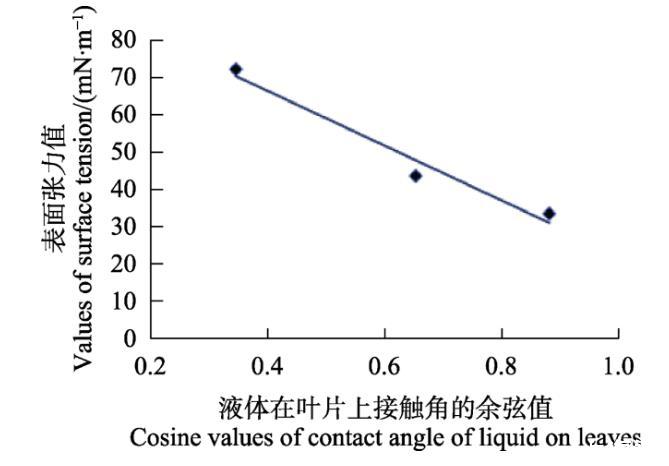 采集新鮮的芒果葉片,新老葉比例1∶1,取其平整部分且不破壞其葉面結構,用雙面膠將其固定在載玻片上構成平面,使葉面保持自然狀態。分別將水、二甲基甲酰胺(DMF)、二甲基亞砜(DMSO)3種液體通過微量注射器滴加到葉面上,當液體在葉面形成液滴后,通過接觸角測定儀拍照后測量其接觸角。從滴加樣品到測得接觸角在5 s內完成,每個處理重復10次,取平均值。液體的表面張力值通過表面張力儀測定,每個處理重復5次,取平均值。將測得的水、DMF、DMSO液體表面張力值和接觸角的cosθ值分別為橫縱坐標作圖,獲取回歸方程,當接觸角為零時求得芒果葉的臨界表面張力值。為確保液滴的完整性和穩定性,整個測定過程的溫度保持在25~28℃,相對濕度為80%左右的封閉環境下進行。