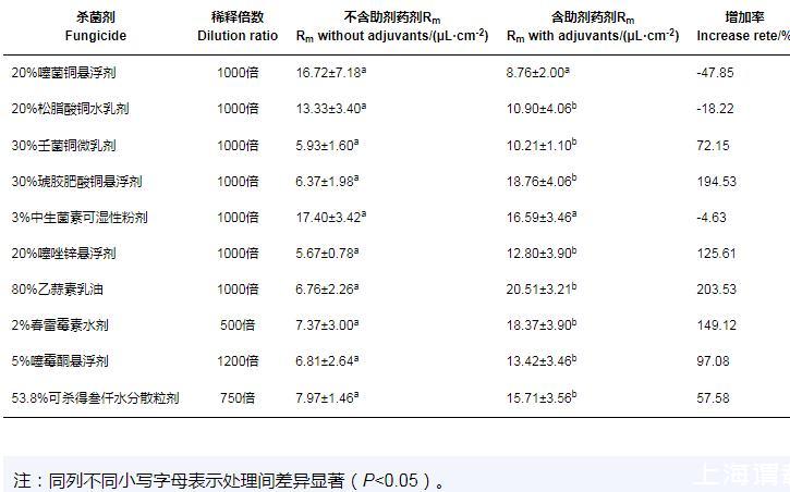 加入助劑前后,除20%噻菌銅懸浮劑、20%松脂酸銅水乳劑和3%中生菌素可濕性粉劑在‘貴妃'芒果葉片上的最大持留量(Rm)無顯著差異外,其他殺菌劑的Rm值均呈顯著差異。其中,80%乙蒜素乳油和30%琥膠肥酸銅懸浮劑的Rm值分別為(6.76±2.26)μL/cm2和(6.37±1.98)μL/cm2,加入助劑后藥液在葉片上的最大持留量可達(20.51±3.21)μL/cm2,效果最好,分別為增加了203.53%和194.53%。加入助劑后,藥液在單位面積葉片持留量的增加率從大到小依次為,80%乙蒜素乳油>30%琥膠肥酸銅懸浮劑>2%春雷霉素水劑>20%噻唑鋅懸浮劑>5%噻霉酮懸浮劑>30%壬菌銅微乳劑>53.8%可殺得叁仟水分散粒劑,持留量增加率分別為203.53%、194.53%、149.12%、125.61%、97.08%、72.15%和57.58%(表3)。