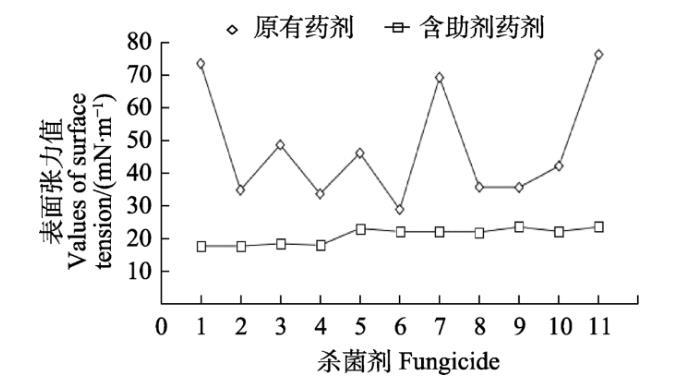 參照各供試殺菌劑田間推薦劑量,分別配置10 mL藥液2組,其中一組添加助劑,一組不含助劑。通過表面張力儀測試各藥液的表面張力值。每組設置3個重復,以水作為空白對照。
