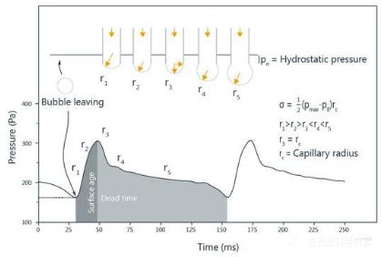 測量結(jié)果對應(yīng)的是一定表面年齡下的表面張力,表面年齡為從氣泡開始產(chǎn)生到最大壓力之間的時間。表面張力對表面年齡的關(guān)系可以通過不同的鼓泡速度測出。