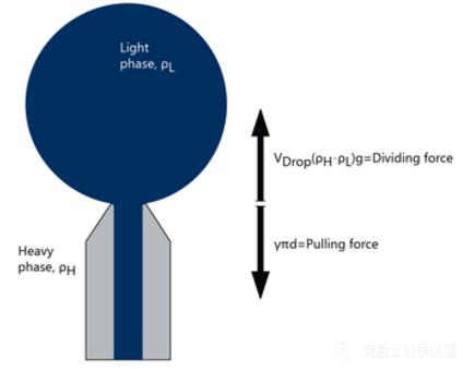 由于界面張力γ的作用,液滴試圖在體相中保持盡可能小的界面。當(dāng)液滴從毛細管上脫落時,新的界面產(chǎn)生,這需要克服相應(yīng)的界面張力,液滴直到舉升力能夠補償毛細管潤濕長度上的界面張力時才會脫落,關(guān)系式如下:g=重力加速度,V=液滴體積,d=毛細管內(nèi)徑,Δp=兩相密度差