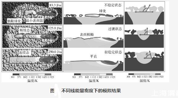為分析線能量密度對球化缺陷形成機理的影響,選取激光功率150 W,線能量密度分別為83.3 J/m、125.0 J/m和250.0 J/m的3組參數(shù)進行數(shù)值模擬,結(jié)果如圖2所示。當線能量密度為83.3 J/m時,部分熔融金屬凝固并與周圍粉末黏附成球;部分熔融金屬在表面張力的驅(qū)使下傾向于減少表面能,迅速地成球;這兩種成球方式往往共同出現(xiàn)。這是因為激光的穿透深度沒有到達基板,此時接觸角為180°,呈現(xiàn)不完全濕潤狀態(tài),液態(tài)金屬流動受阻,因此不能在基板上鋪展。當線能量密度提高到125.0 J/m時,單道由球化形態(tài)向斷續(xù)態(tài)過渡,雖然表面還比較粗糙,但是球化效應(yīng)明顯減弱,此時激光穿透深度剛剛到達基板,接觸角約為90°。當線能量密度繼續(xù)提高到250.0 J/m時,熔化的金屬粉末形成充足的熔融金屬,從而改善其流動性,凝固后獲得高度均勻和連續(xù)的單道,激光穿透深度能夠穿透粉末床并熔化基板,并且接觸角大于90°。因此,球化缺陷的形成機理可以總結(jié)為能量密度太低,熔融金屬不能在基板上鋪展。判斷是否球化最直接的依據(jù)是觀察熔池深度是否穿透粉末層厚,并熔化了基板,也可以計算熔池的接觸角是否小于90°來判斷熔池的濕潤性。此外,還可通過適當提高線能量密度,提高熔融金屬的流動性,以獲得更均勻和連續(xù)的單道。