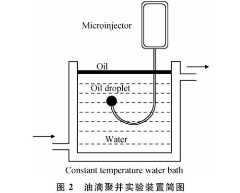 以甲苯與正庚烷(體積比為1/1)為溶劑,將不同原油組分配制成為質(zhì)量分?jǐn)?shù)1%的溶液作為油相,以模擬殘余HMPAM溶液為水相,利用如圖2所示的實驗裝置:由微量注射泵、彎鉤以及可加熱水槽組成,開展油滴聚并實驗以評價液滴穩(wěn)定性(或界面穩(wěn)定性)。利用微量注射泵(可間斷注射)通過彎鉤注射30個30μL的油滴,由于密度差的原因,油滴會在樣品池中上浮;在樣品池上層有一層油相,油滴上浮碰到油相時開始計時,當(dāng)油滴完全和油相融合時停止計時,這一段時間可以定義為油滴的聚并時間;這期間的過程利用快速攝像錄下,然后分楨計算后,得到所需聚并時間。