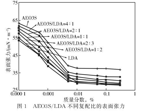 在25℃測試了AEO3S和烷醇酰胺LDA表面活性劑及其在不同質量配比下溶液的表面張力,實驗結果見圖1。根據相對分子質量計算出表面活性劑AEO3S的摩爾分數(αAEO3S)。由圖1中濃度與表面張力的關系得到溶液的CMC及對應濃度下的表面張力,實驗結果見表1。